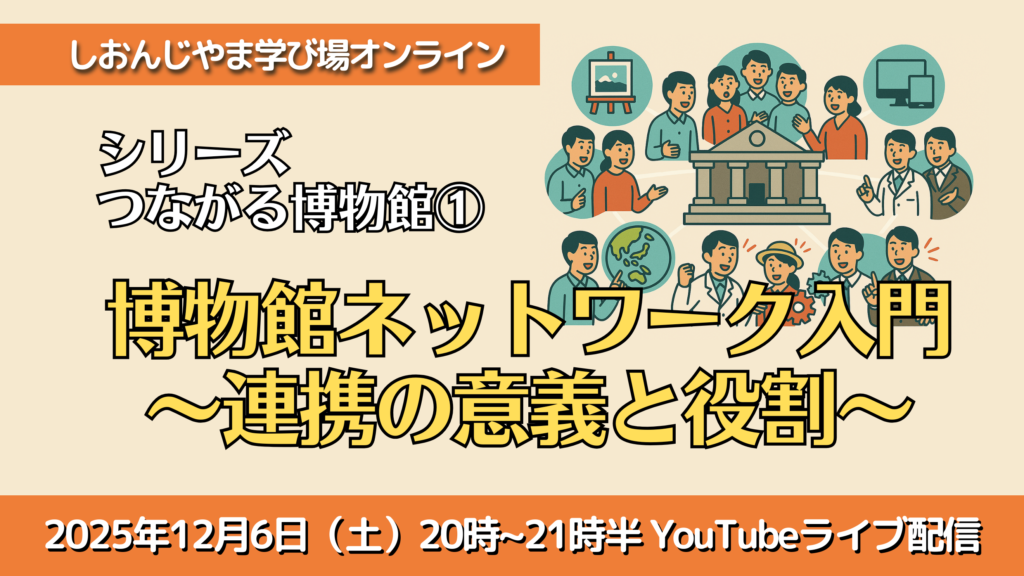 2025年度後半の配信は、シリーズ「つながる博物館」として、博物館と地域、そして人々のつながりから生まれる新しい学びや交流のかたちを探ります。その第1回目は「博物館ネットワーク入門~連携の意義と役割~」と題し、博物館同士や博物館と地域との連携がもたらす可能性について、当館の活動事例や、他地域での状況などから、その意義と役割について語り合います。是非ご視聴下さい!!